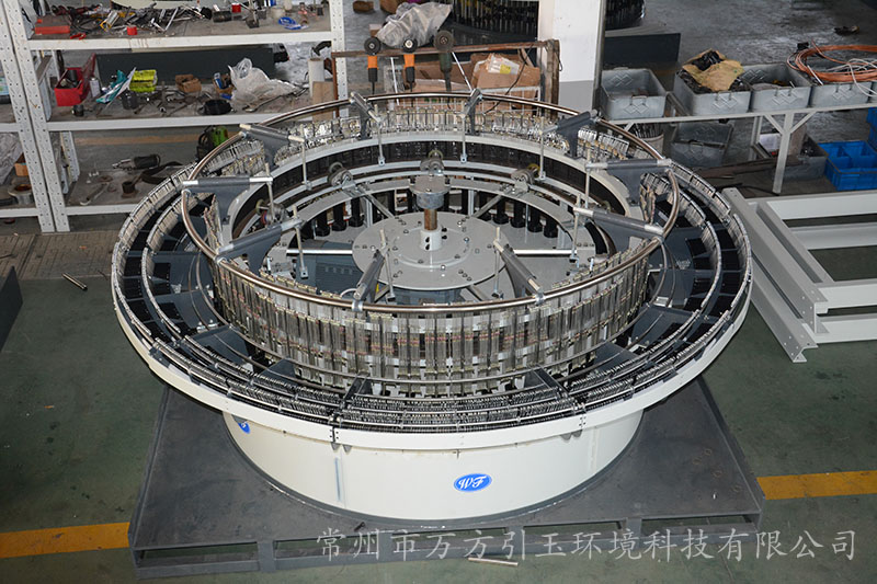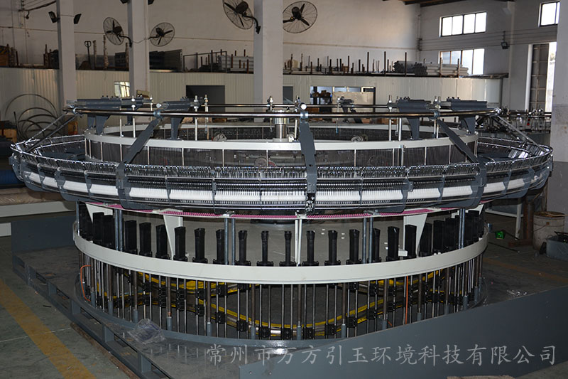 圓織機的經紗架上有有許多紗錠,依據編織布幅寬和扁絲寬度,使用規定范圍數量的經紗.經紗進入圓織機前,由經紗的棕框對經紗進行交叉開口,緯紗梭子在交叉開口中作圓周運動穿過經紗,編織成筒布. 一臺圓織機有幾把梭子,就有幾條緯紗同時織入.對于平織布,可用平織機,片梭織機,噴水織機編織.